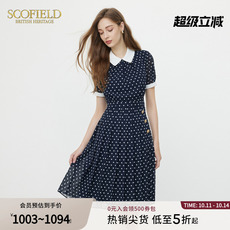 Scofield女装复古波点职场小黑裙百褶收腰印花连衣裙夏季裙子