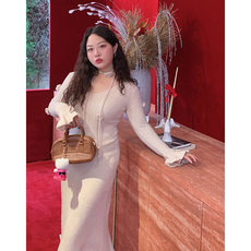 秋冬法式中长款女装蕾丝拼接纯色针织毛衣胖MM300斤加大码连衣裙