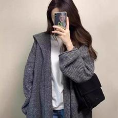 中长款100%羊毛连帽开衫女带兜长袖针织外套毛衣宽松羊绒外搭大衣