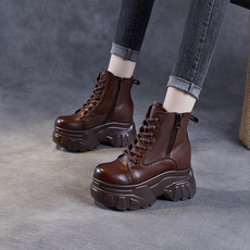真皮短靴女2025秋冬新款复古松糕厚底增高头层牛皮系带轻便马丁靴