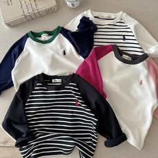 儿童T恤春秋2025新款男童拼色插肩袖条纹潮宝宝加厚打底衫女洋气