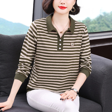 长袖t恤女纯棉翻领条纹春秋装新款中年妈妈上衣女士POLO领打底衫