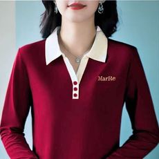 妈妈秋季新款纯棉长袖翻领拼色T恤衫中老年减龄宽松女上衣打底衫