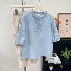 时尚棉麻套装女夏季中年妈妈装洋气减龄亚麻刺绣上衣阔腿裤两件套