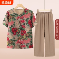 中年妈妈夏装套装休闲奶奶女装上衣中老年夏季大码两件套绵绸套装