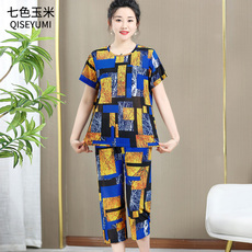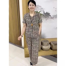 妈妈装夏季休闲冰丝套装宽松大码奶奶短袖上衣宽松中老年人两件套