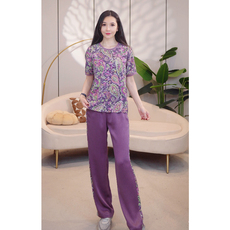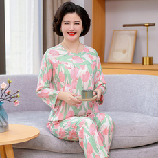 2023棉绸套装女时尚外穿夏季两件套妈妈中年长裤睡衣东北大花洋气