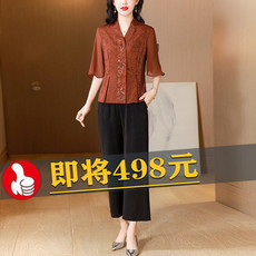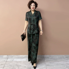 高档中老年妈妈真丝两件套夏季新款国风短袖衬衫阔腿裤洋气套装女