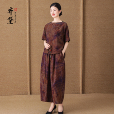 大码休闲棉麻短袖套装女夏季2025年新款文艺复古妈妈灯笼裤两件套