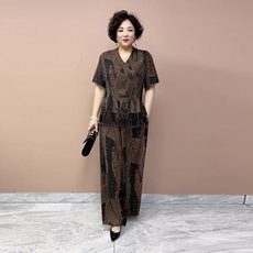 2024年夏季新中式国风V领妈妈真丝套装女短袖阔太太两件套+阔腿裤
