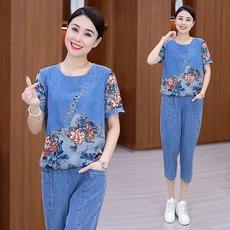 大码女装夏季短袖T恤两件套时尚印花洋气中老年妈妈休闲运动套装
