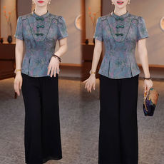 高端夏季真丝妈妈洋气短袖大码衬衫宽松遮肉旗袍衫阔腿裤两件套装