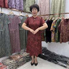中老年夏装新款云锦丝弹力缎重工刺绣旗袍圆领连衣裙高贵妈妈裙子