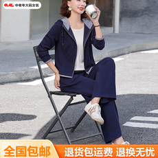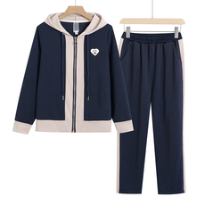 中老年妈妈春秋撞色连帽拉链运动卫衣外套套装女百搭直筒裤两件套