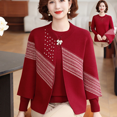 妈妈装春秋季针织开衫两件套中老年女秋装毛衣外套打底外穿羊毛