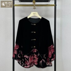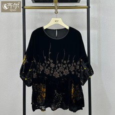 2025春装真丝绒妈妈大码宽松遮肉显瘦烫钻V领旗袍衫上衣打底小衫