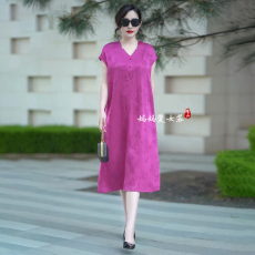夏季中年妈妈装国风短袖连衣裙时尚气质减龄时尚过膝真丝提花长裙