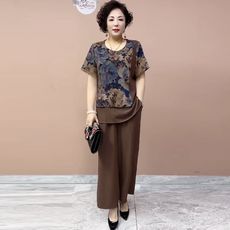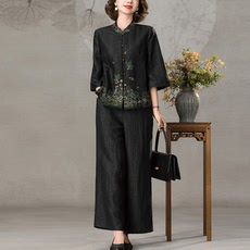 中老年妈妈真丝套装夏季新款桑蚕丝印花旗袍衫上衣套裤显瘦两件套