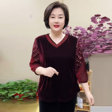 大码妈妈秋真丝绒拼接小衫新款T恤中老年人套装阔太太洋气上衣服