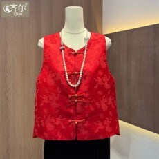 高端红色真丝缎提花国风马甲女盘扣洋气高级感年轻妈妈装外穿马夹