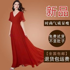 香妮芬夏季新款短袖中年妈妈连衣裙喜庆红色雪纺裙子女大码装