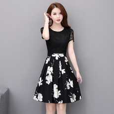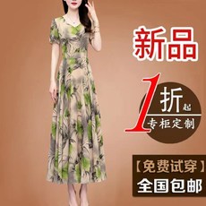 M2女装品牌折扣春夏中年妈妈收腰显瘦大码雪纺印花短袖连衣裙