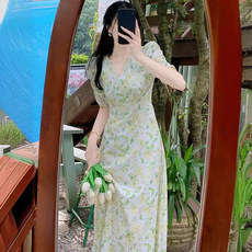 法式旗袍夏季雪纺V领裙新款妈妈装法式休闲性感短袖修身显瘦欧美