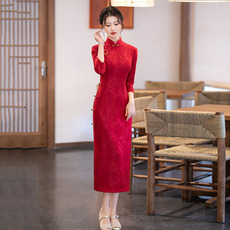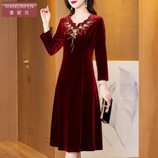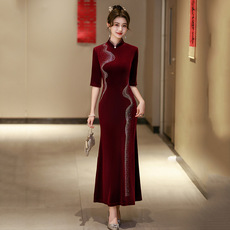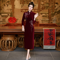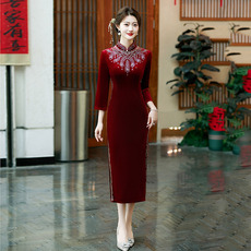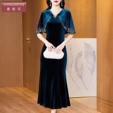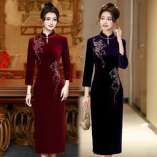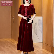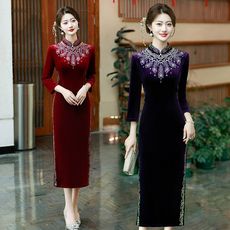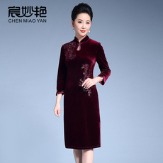 宸妙艳新款金丝绒连衣裙高贵妈妈装中长款婚宴礼服大码改良旗袍