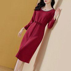 酒红色轻礼服女长袖2025春秋季新款喜庆婆婆妈妈婚宴装包臀连衣裙