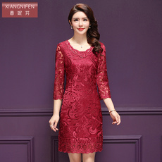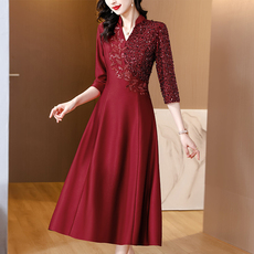 香妮芬2025秋季新款蕾丝刺绣中年喜庆红色婚宴连衣裙妈妈装礼服