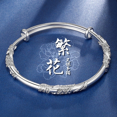 繁花似锦银手镯女士纯银足银S999推拉实心镯子送女友妈妈生日礼物