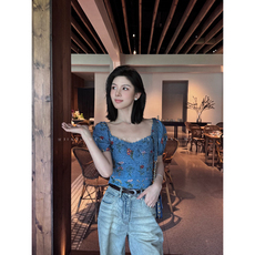方领碎花短袖上衣蓝色娃娃衫短款掐腰露锁骨泡泡袖T恤女法式高级