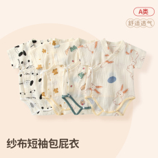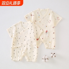 新生婴儿夏天爬服薄款纯棉双层短袖纱布哈衣宝宝无骨斜襟连体衣