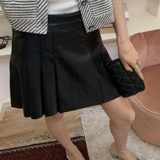 Deessesicile 非正式学院风黑色绵羊皮真皮百褶裙女秋冬a字半身裙