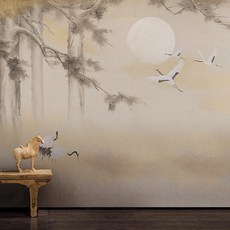 琉璃赋白鹤壁画现代简约墙纸客厅电视背景墙手绘水V彩定制个性壁