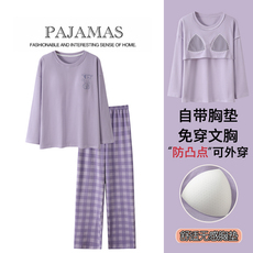 带胸垫一体式睡衣女春秋季纯棉长袖长裤简约休闲家居服可外穿套装