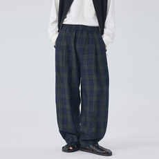 2025年春夏新款男士长裤宽松亚麻墨绿格子休闲松紧腰弯刀裤潮流