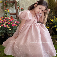 女童泡泡袖波点连衣裙夏季2025新款小女孩法式洋气演出礼服公主裙