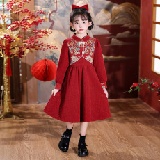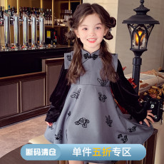 女童新中式长袖连衣裙秋装新款国风丝绒拼接小女孩公主旗袍裙