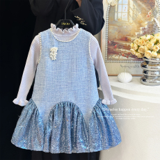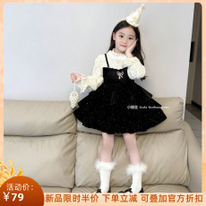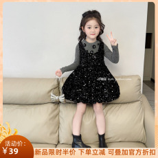 女童黑色丝绒亮片蛋糕裙连衣裙2025秋女孩闪闪假两件公主裙生日裙