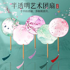 团扇古风扇子儿童夏天半透长柄舞蹈扇女童古装汉服旗袍刺绣小圆扇