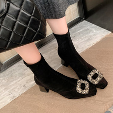 小码31 32 33水钻绒面方扣短靴女黑色百搭方头平底大码41马丁靴43