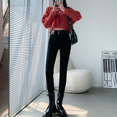 加绒打底裤女外穿秋冬高腰紧身收腹薄绒仿牛仔小脚九分黑色女裤子