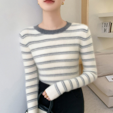 红莲2025秋冬新款山羊绒衫女圆领条纹撞色修身显瘦百搭针织衫毛衣