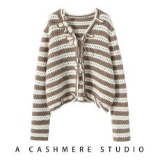 重工加厚条纹拼色镂空山羊绒针织开衫秋冬女V领系带毛衣减龄外套