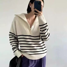 经典条纹半拉链翻领山羊绒衫女25秋冬新款宽松显瘦保暖针织衫毛衣