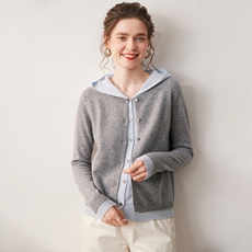 拼色连帽假两件山羊绒针织开衫秋冬新款女减龄显瘦百搭羊毛衫外套