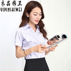 V领短袖春夏新款白色衬衫蓝灰棉涤女士不透衬衣酒店修身职业工装