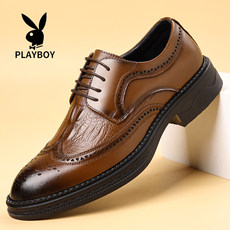 花花公子男鞋商务休闲皮鞋男士尖头系带真皮正装透气雕花布洛克鞋