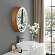 圆形浴室镜柜带灯实木智能镜箱防雾储物卫生间化妆壁挂圆镜挂墙式